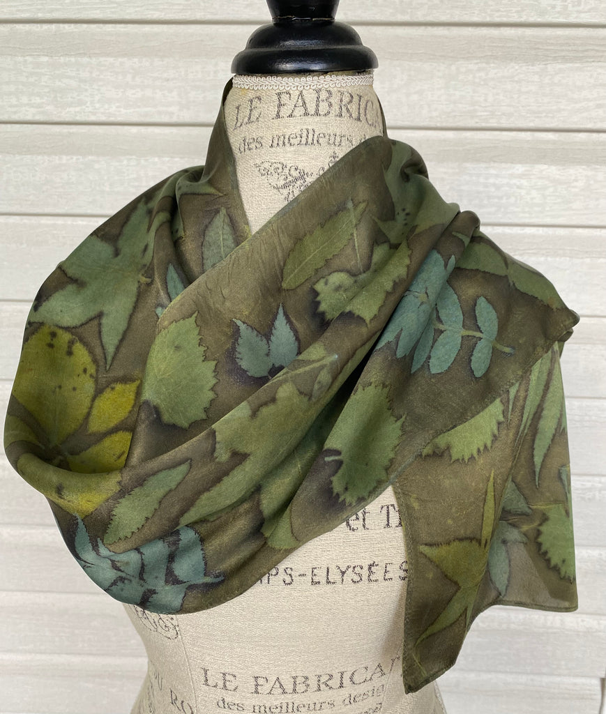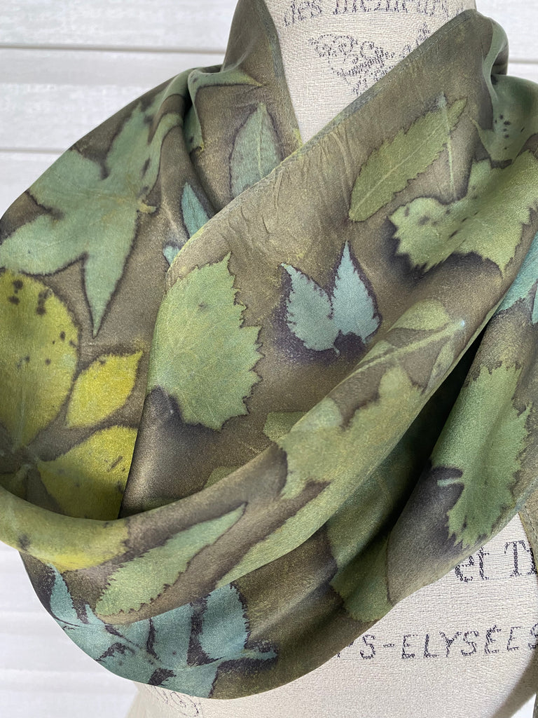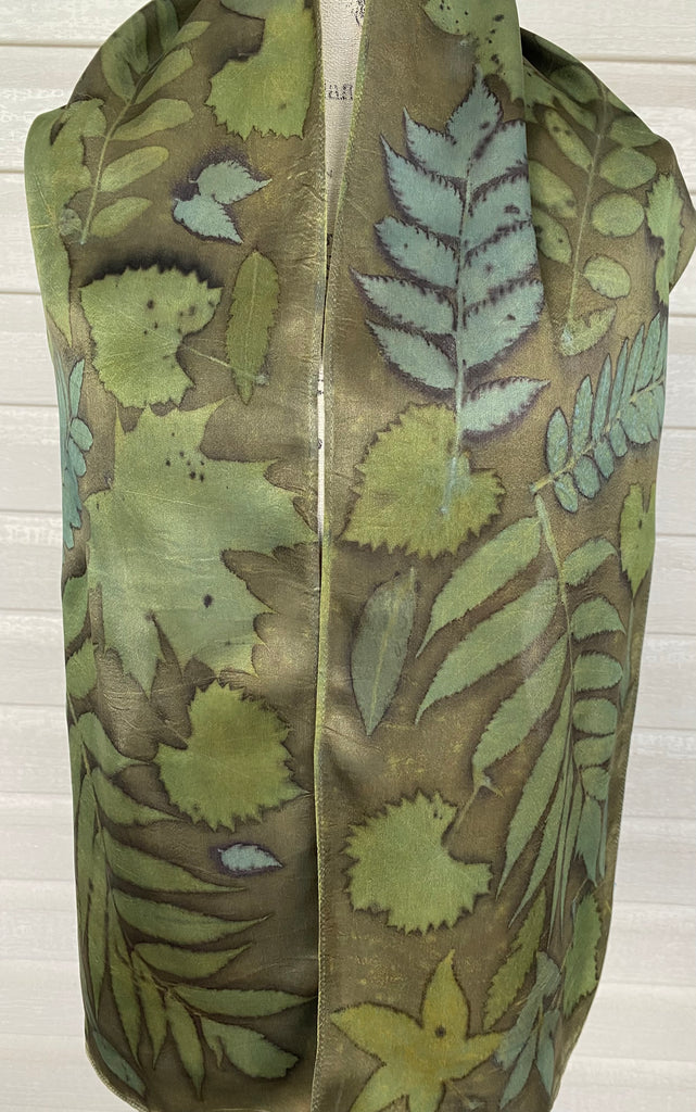 This scarf is one-of-a-kind piece. Every step is done by hand, using the process of mordanting that ensures light-fastness and natural color adherence to the fabric. I use the selection of leaves that I source locally in my garden and the surrounding area. Each leaf produces a unique impression (if you look closely, you can see and even feel the veins of some leaf prints.) The combination of natural dye as well as natural tannins and pigments of leaves creates beautifully unique result that is unrepeatable, like the nature itself!