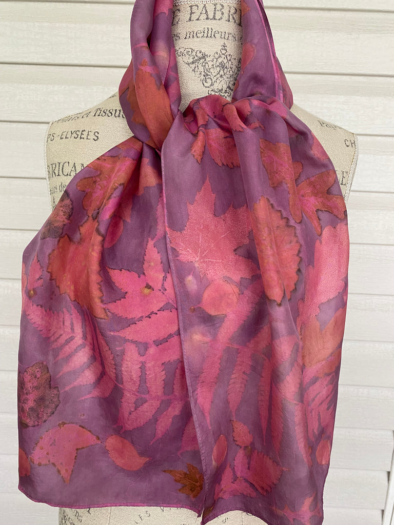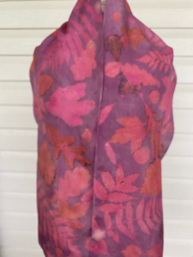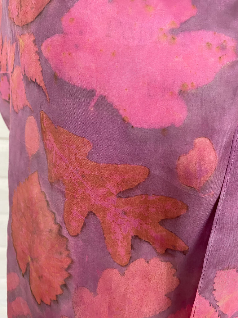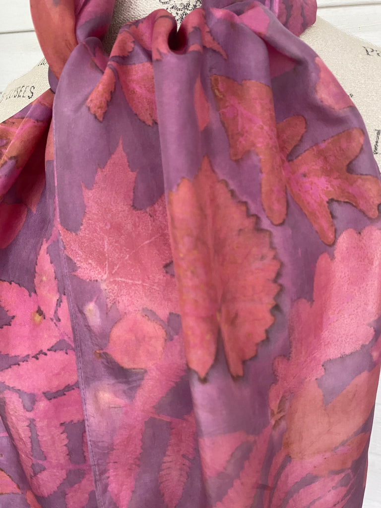 Materials: 100% silk habotai (shiny, flowing natural fabric), mordant, dye (cochineal), leaves.
