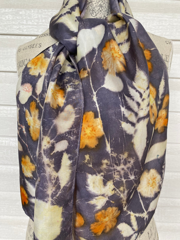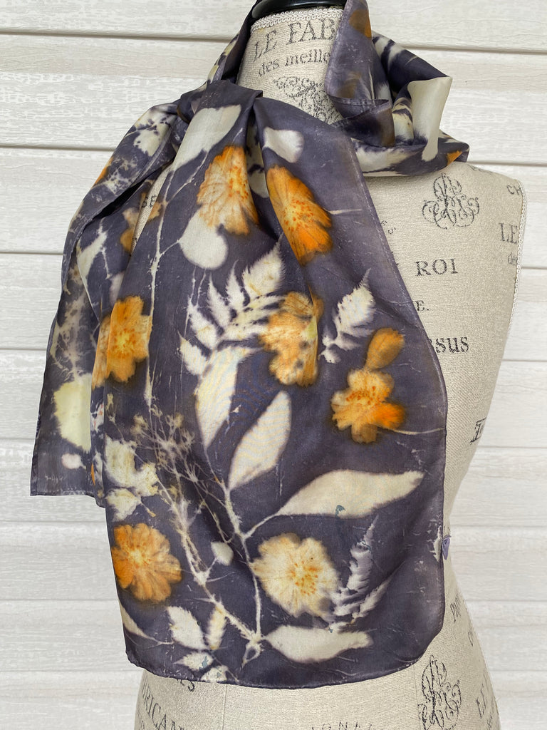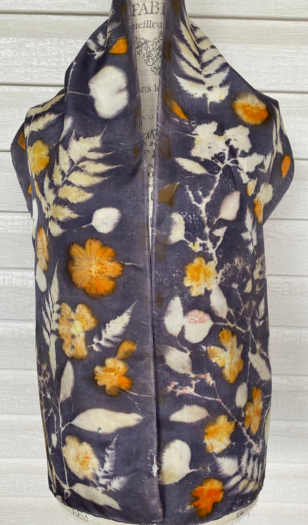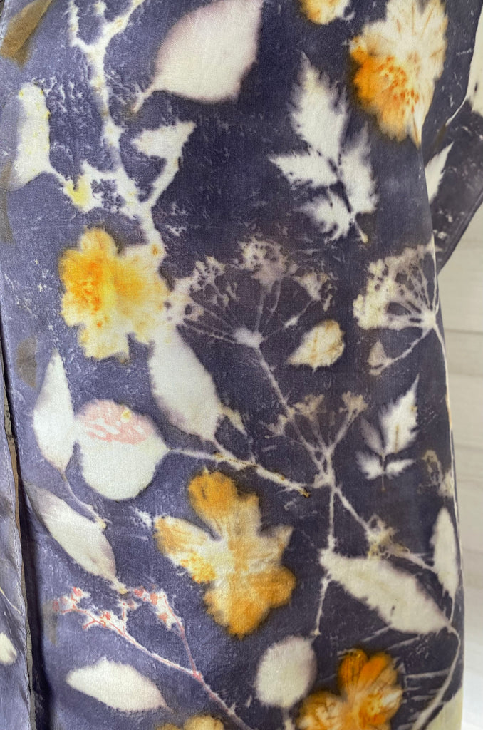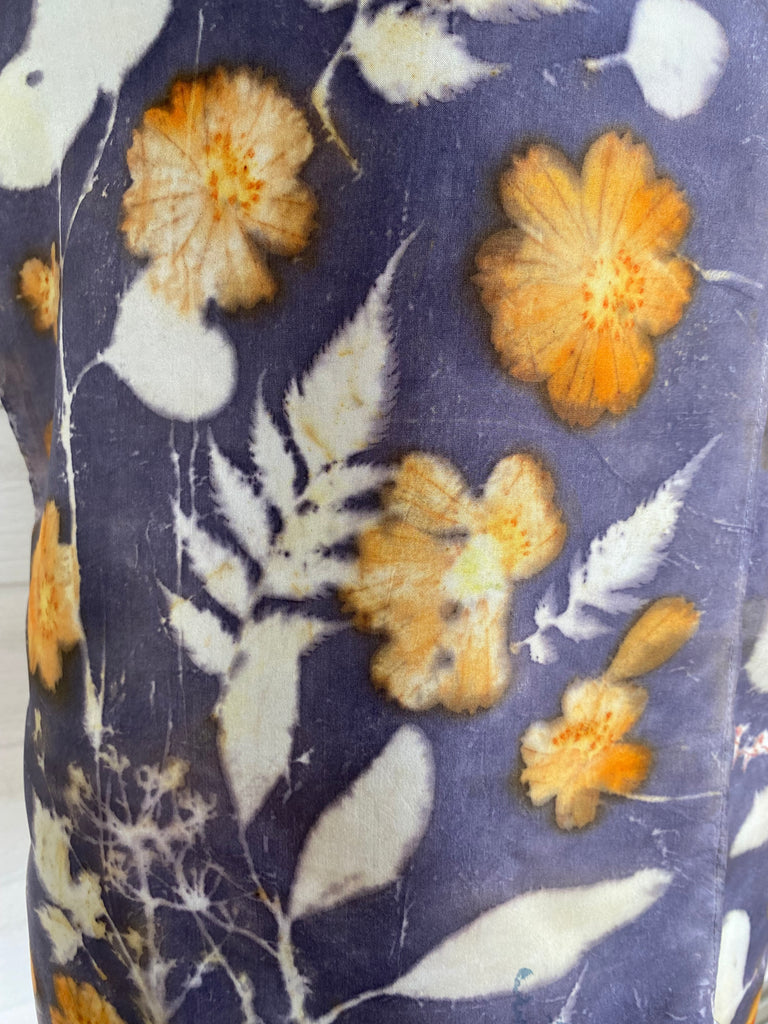 Materials: 100% silk habotai 8mm, mordant, tannin, flowers and leaves.