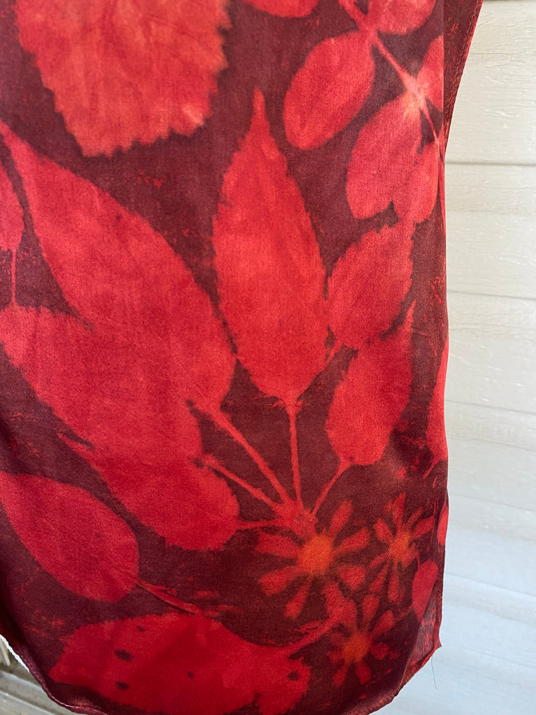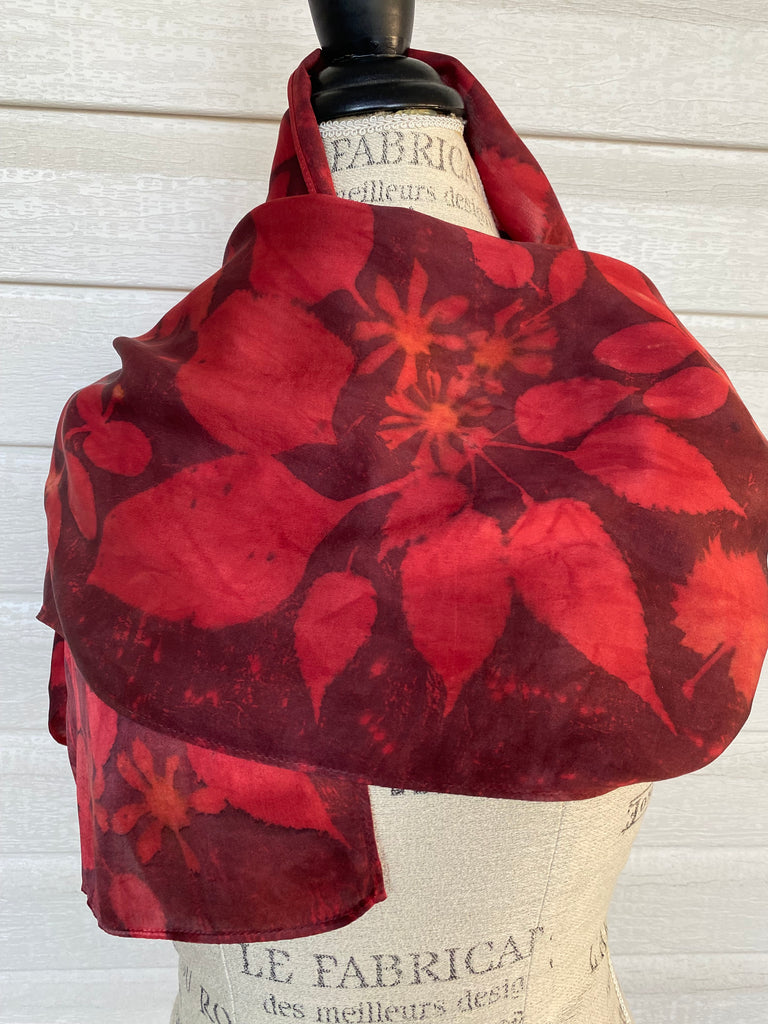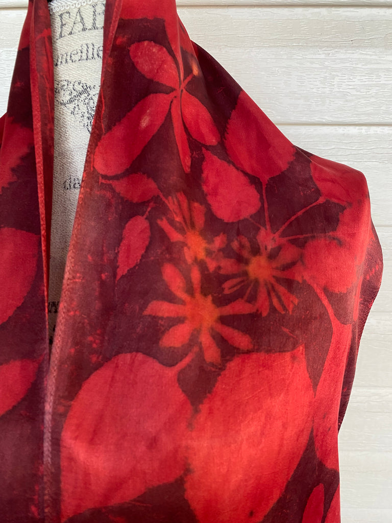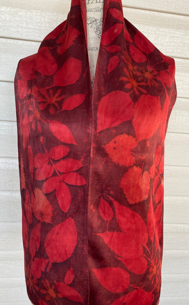 Materials: 100% silk satin (shiny, flowing natural fabric), mordant, dye (madder), leaves and flowers.