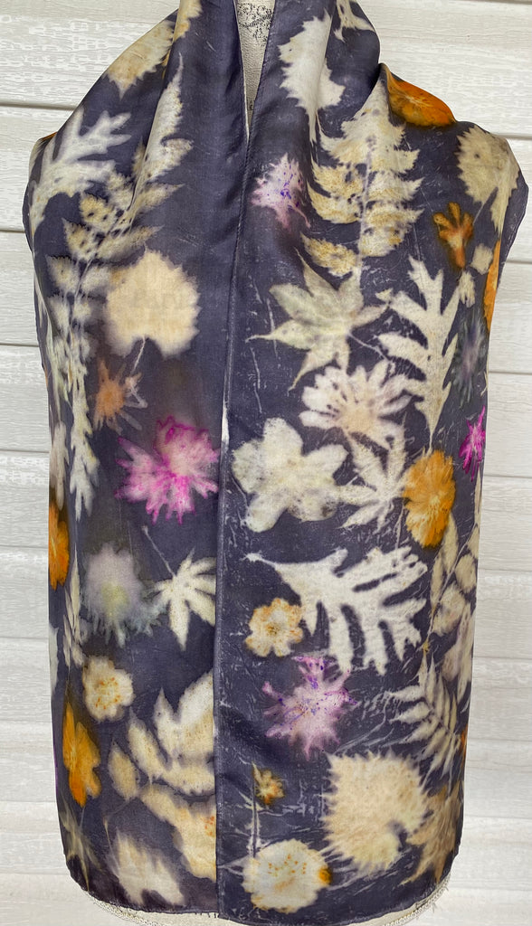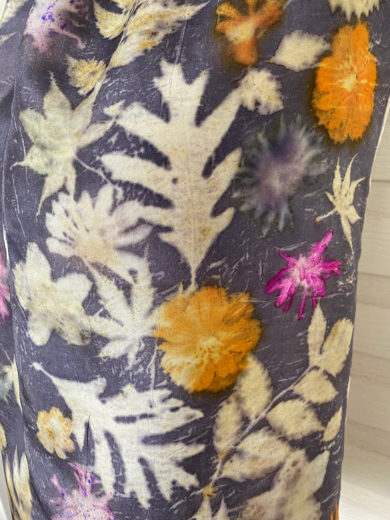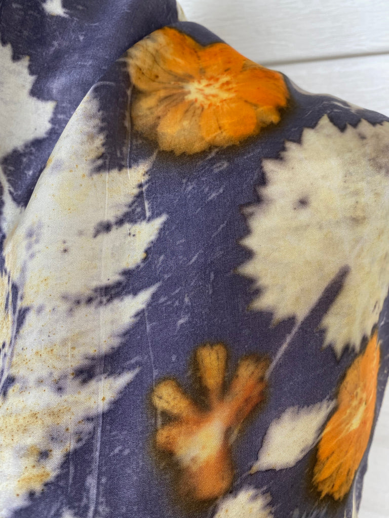 Materials: 100% silk habotai (shiny, flowing natural fabric), mordant, tannin, flowers and leaves.