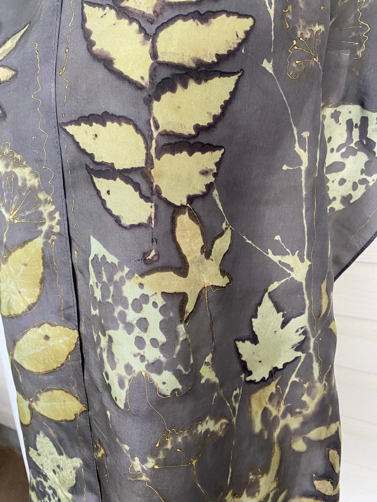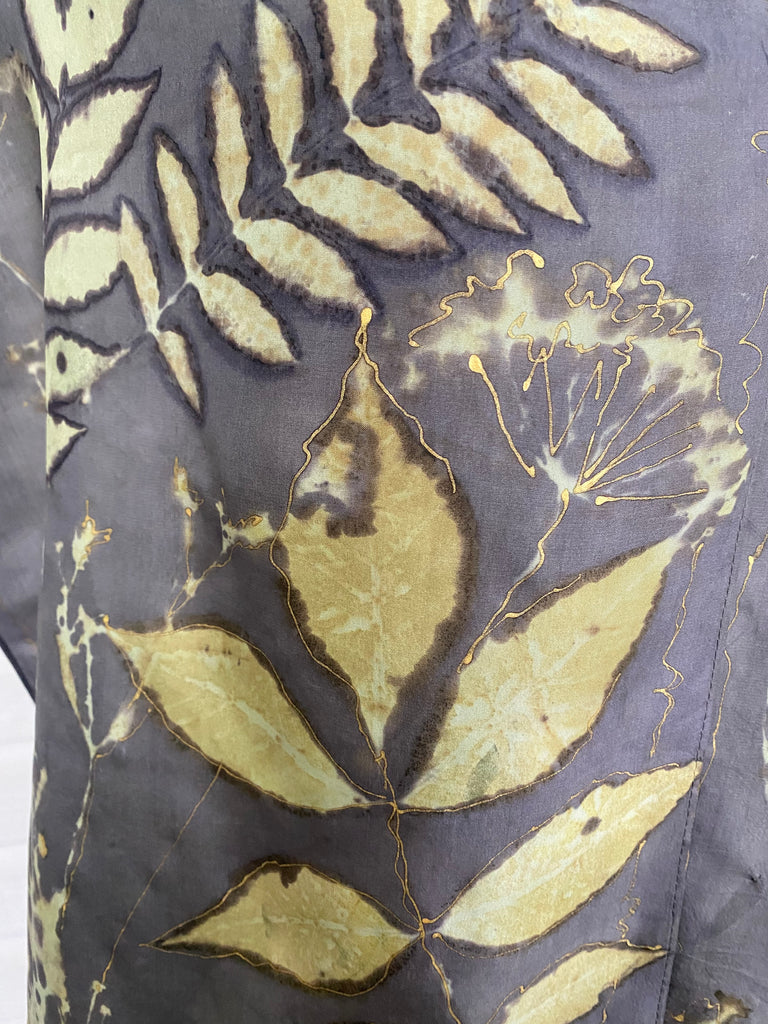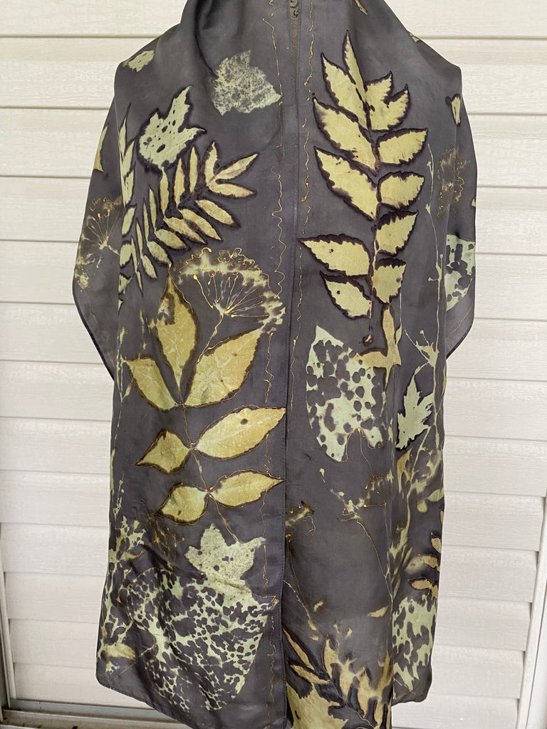 Materials: 100% silk habotai (shiny, flowing natural fabric), mordant, flowers, leaves. Enhanced with gold metallic silk paint outlines.
