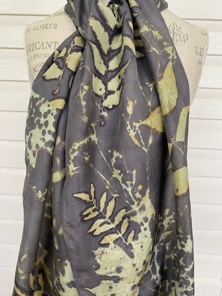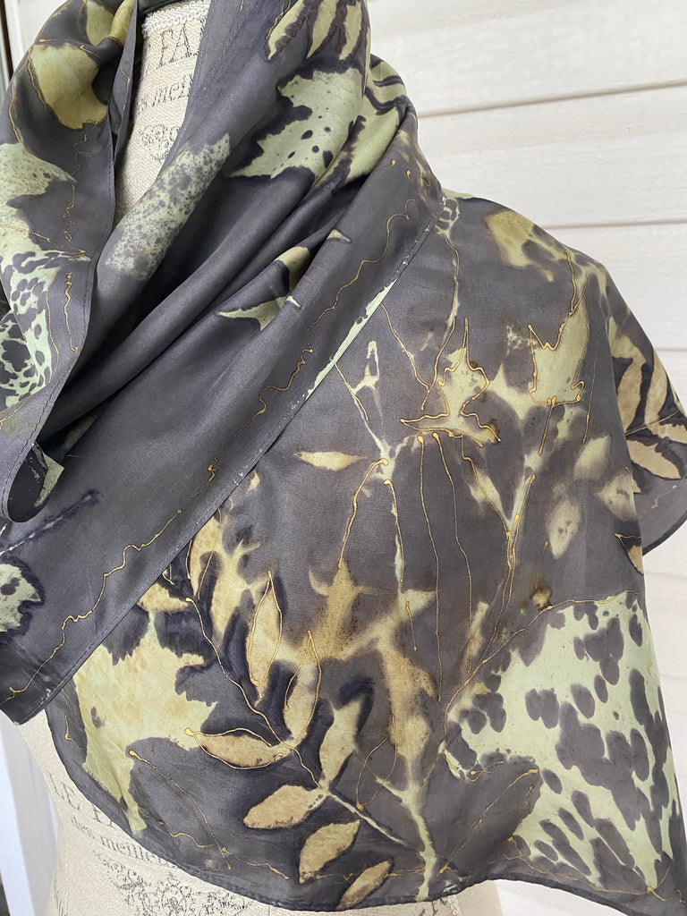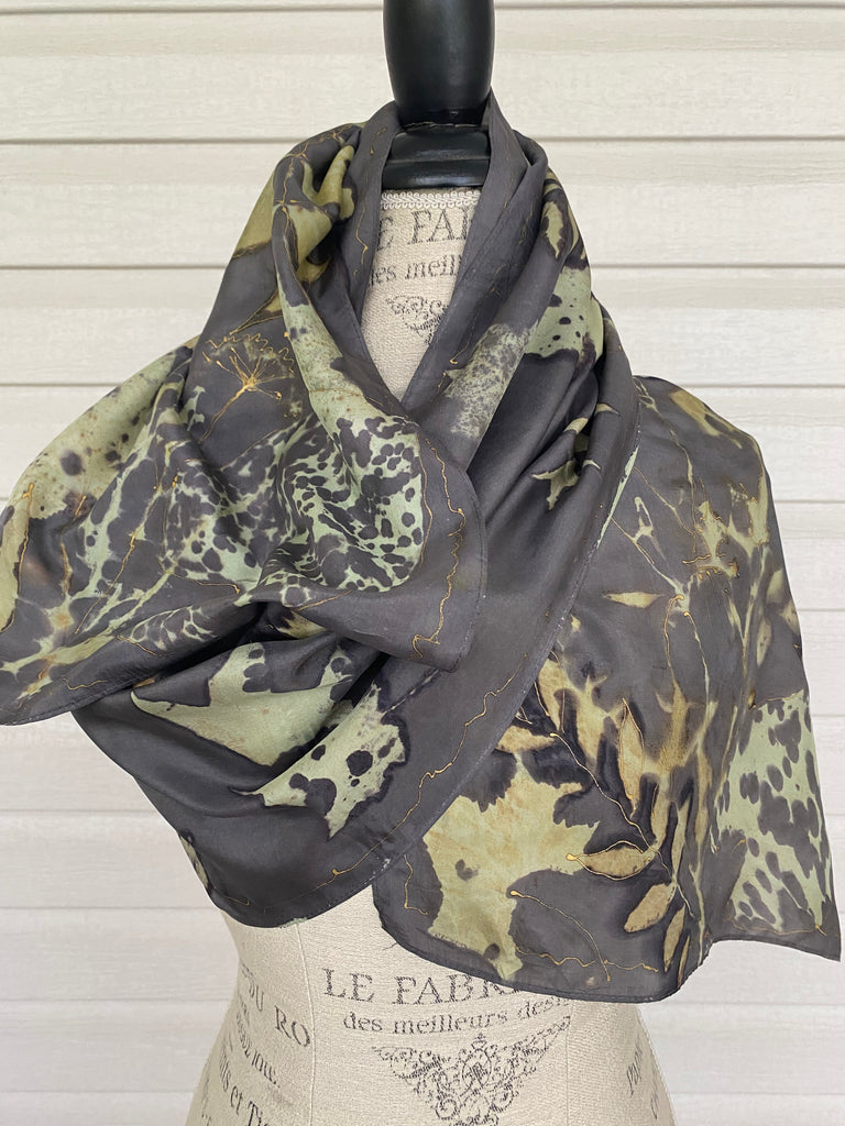 This scarf is one-of-a-kind piece. Every step is done by hand, using the process of mordanting that ensures light-fastness and natural color adherence to the fabric. I use the selection of leaves that I source locally in my garden and the surrounding area. Each leaf produces a unique impression (if you look closely, you can see and even feel the veins of some leaf prints.) The combination of natural dye as well as natural tannins and pigments of leaves creates beautifully unique result that is unrepeatable, like the nature itself!