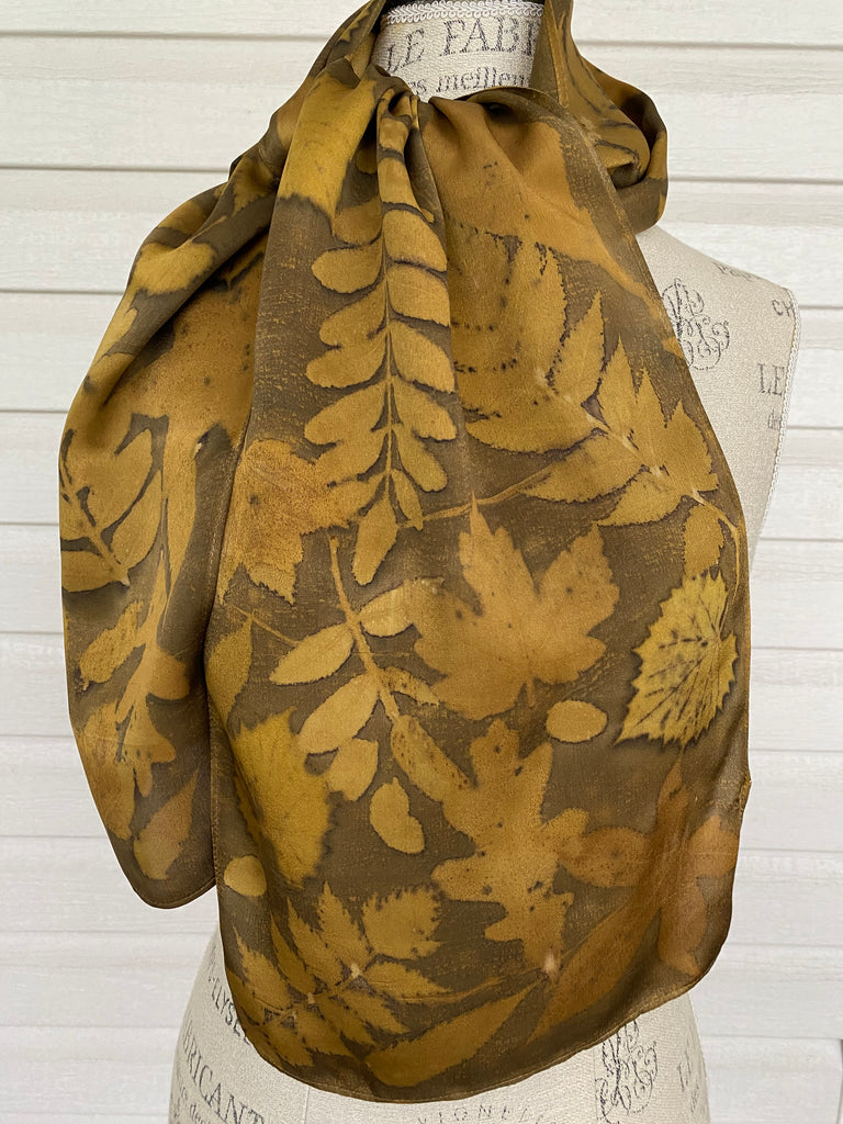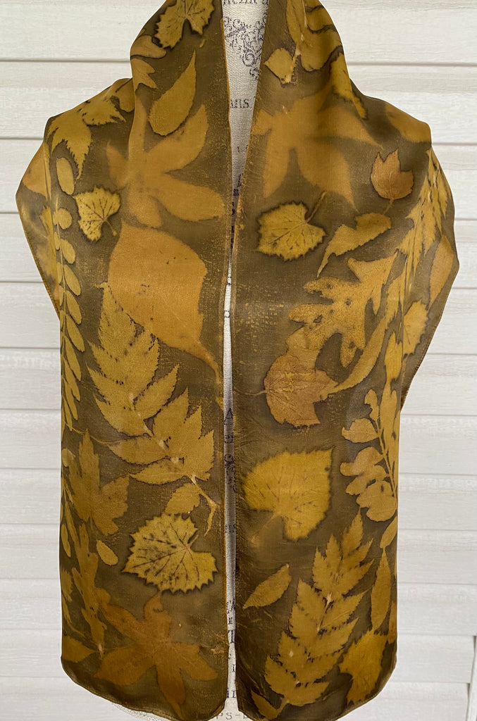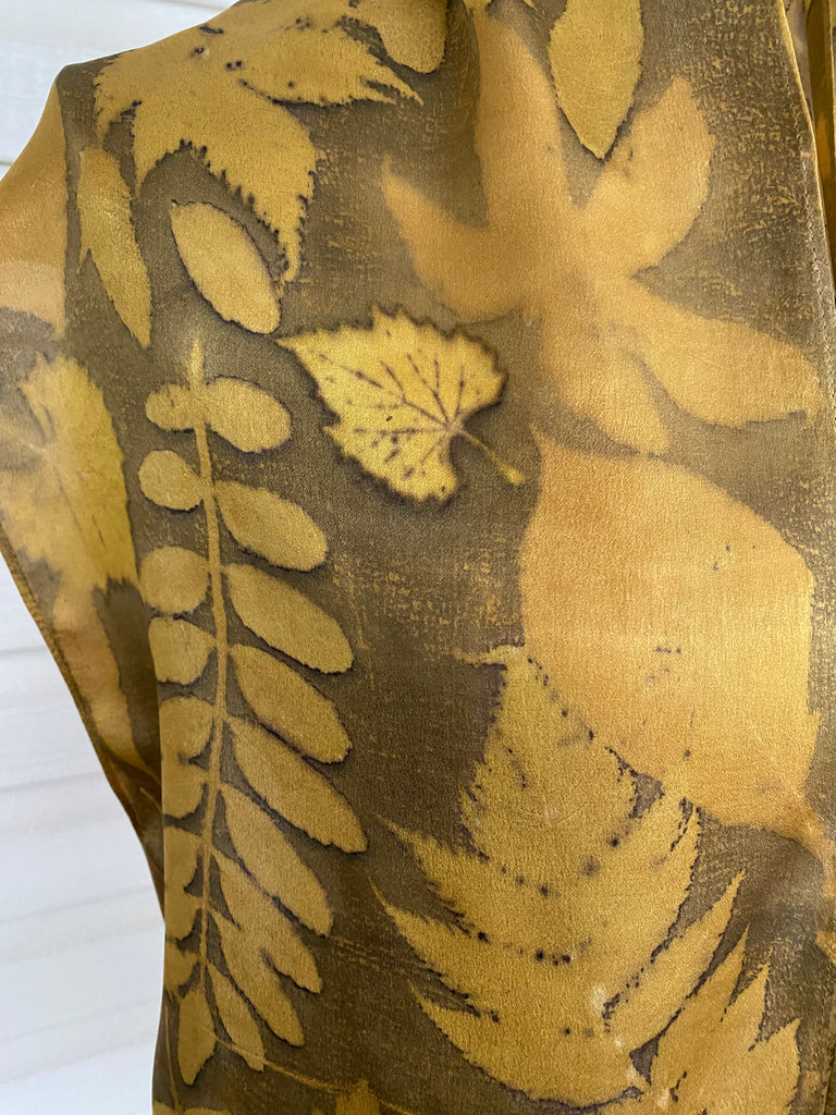 This scarf is one-of-a-kind piece. Every step is done by hand, using the process of mordanting that ensures light-fastness and natural color adherence to the fabric. I use the selection of leaves that I source locally in my garden and the surrounding area. Each leaf produces a unique impression (if you look closely, you can see and even feel the veins of some leaf prints.) The combination of natural dye as well as natural tannins and pigments of leaves creates beautifully unique result that is unrepeatable, like the nature itself!