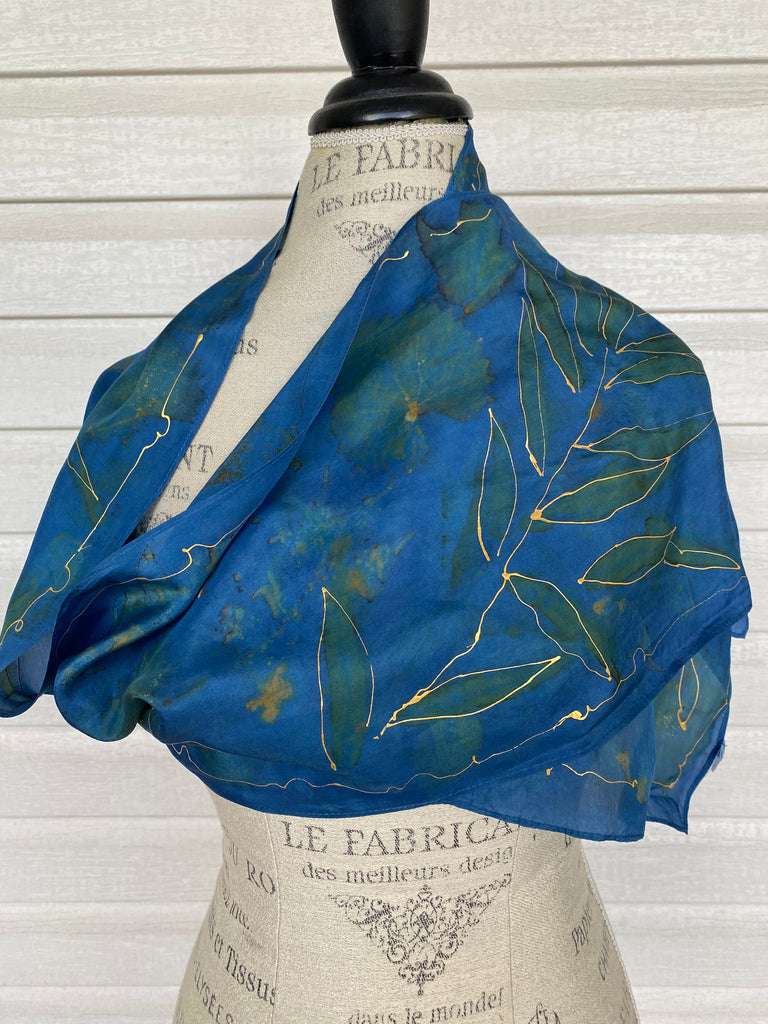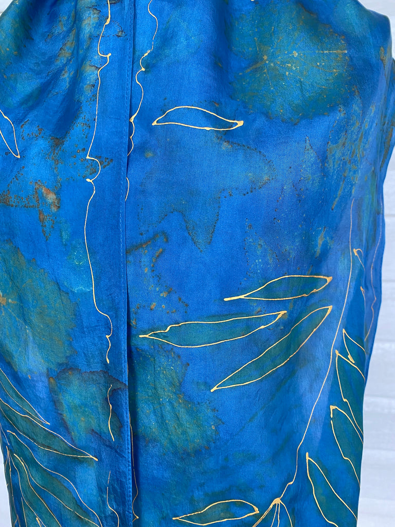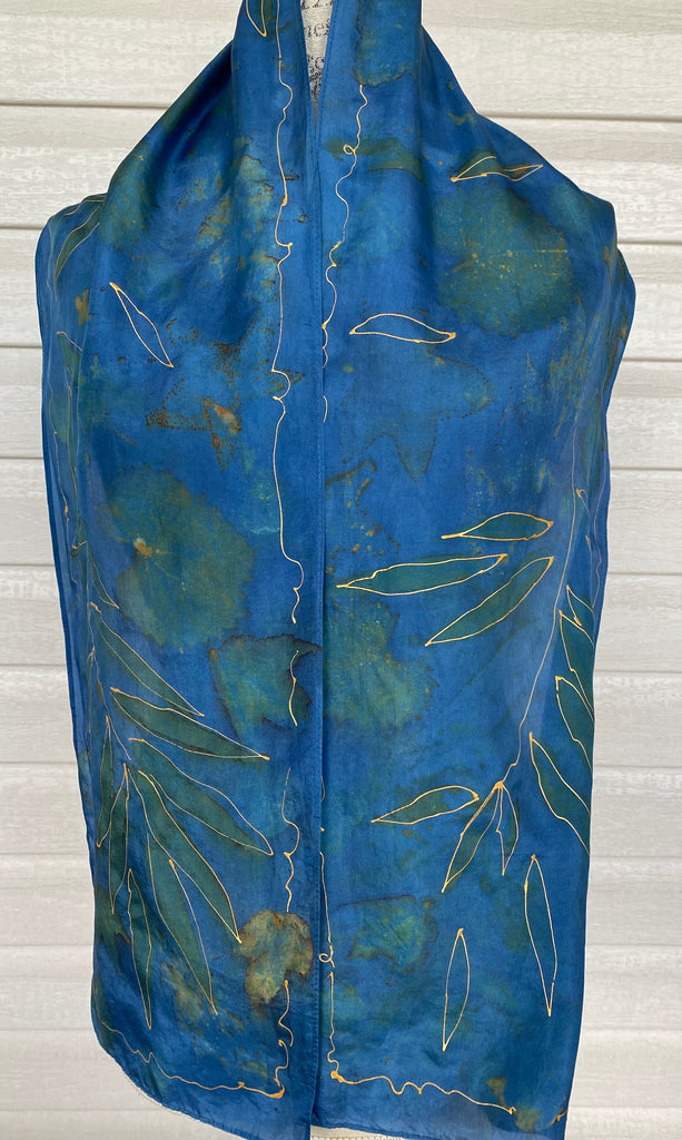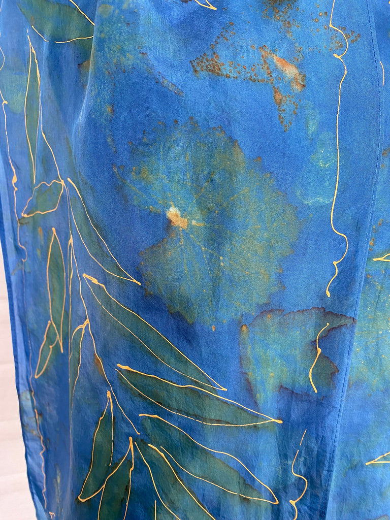 Materials: 100% silk satin (shiny, flowing natural fabric), mordant, dye (indigo), leaves; enhanced with metallic textile paint accents.